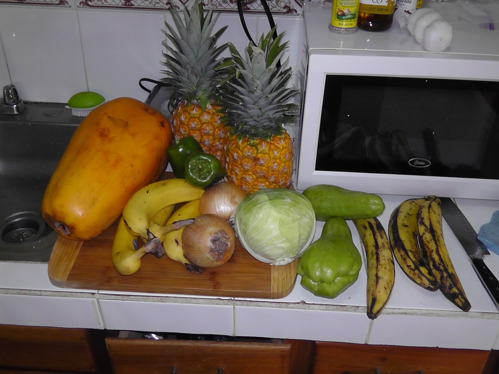After stopping by the park for the internet, I went to the farmers market where a very nice young man fixed me up with everything I needed. Is it possible to eat an entire pineapple and a bowl of papaya for lunch? Umm… yes. I came home with a very large papaya, two pineapples, two onions, two green peppers, two chayotes (summer squash type things, very yummy), four bananas, three plantains, a small cabbage, and a yucca (new experiment) – $7.25.
