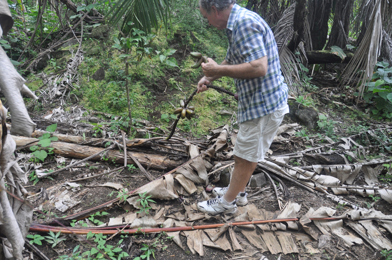 Look, bananas! This tree fell over with its stalk of bananas just waiting to be picked up. We must take them home and try them.