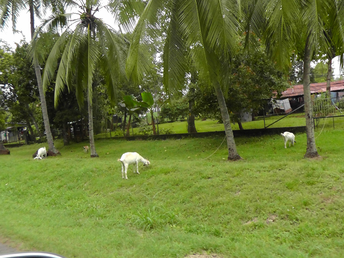 Seen in the southern part of the city, goats trimming alongside the road in a residential neighborhood.