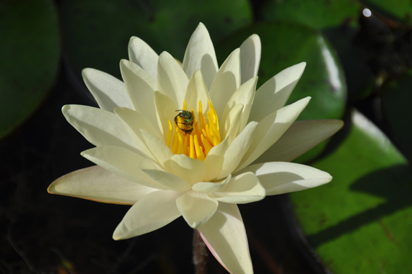 Water lilies are blooming, and this one has attracted a pretty green bee.