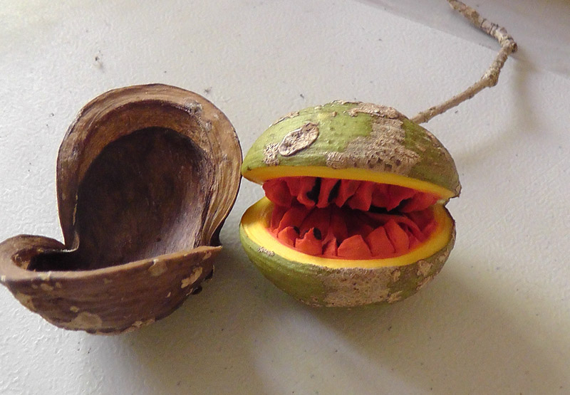 I found what looked like a seed pod that had opened to reveal a green nut. I put it on my desk, and the next day the green nut opened to show me this bright red center!
