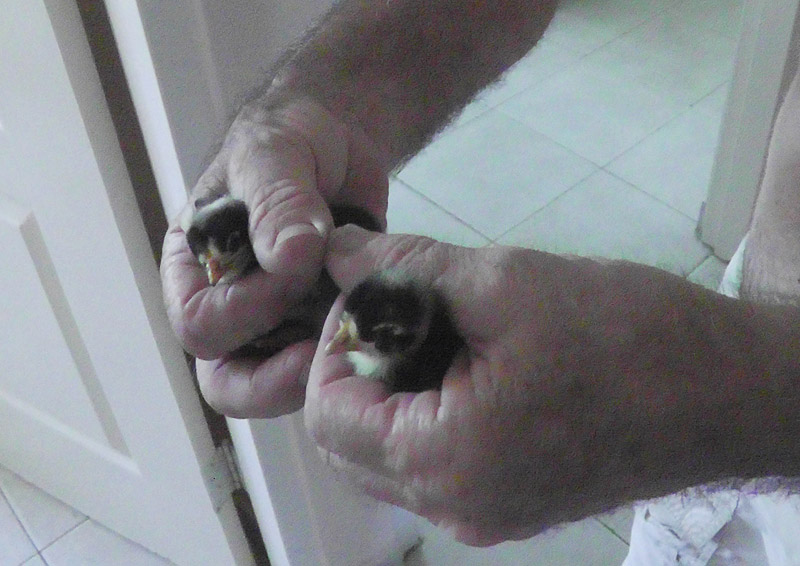 Two of the chicks managed to climb up something and fall over on our side of the fence, so Joel rescued them. Thankfully when we put them back on the other side of the fence they spotted their mom in the distance and took right off towards her, so all is well now.