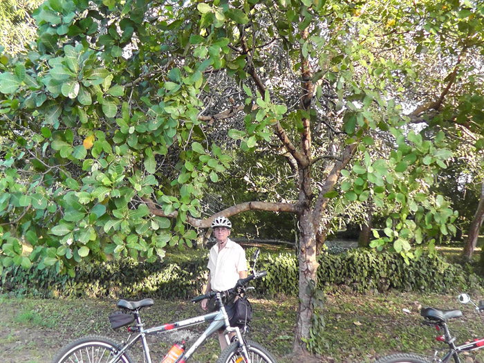 We first noticed a cashew tree when we were bike riding and stopped by the side of the road. We saw things on the tree that I thought must be cashews.