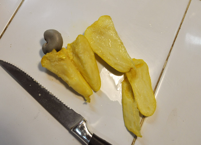 Curiosity overcame me and I brought one home. It did not have a nut or pit inside. It has an odd flavor, not bad, just odd, not especially sweet. The fruit is very light, not very juicy, but almost not edible either. It’s more like something you chew for flavor and then spit out the pulp. It wasn’t quite like chewing gum, but not like fruit either. It’s an odd thing and hard to describe.