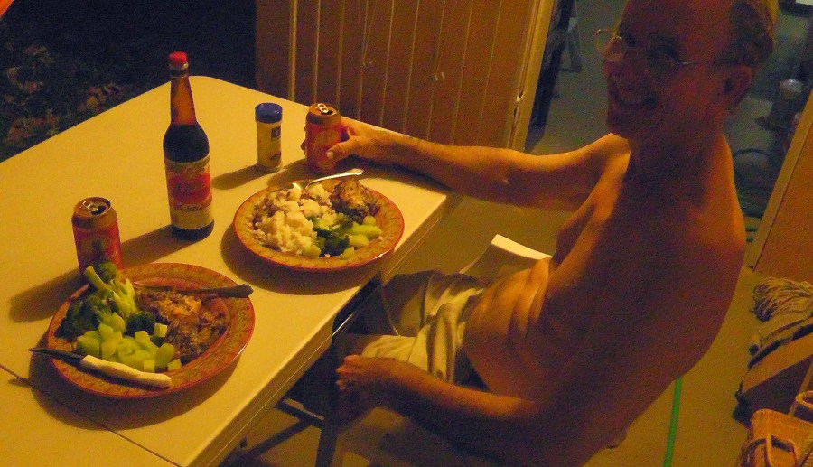 Dinner on the patio – baked chicken, broccoli, chayote squash, Balboa beer. Joel also had some rice.