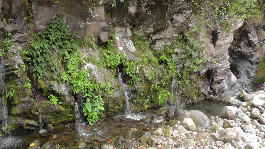 The walls above the river on the way to the canyon are covered with plants and waterfalls.