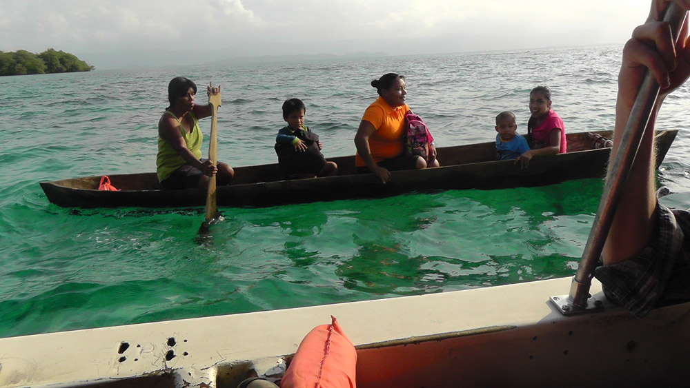 The three kids got in to the canoe, and she paddled off again. Notice how clear and beautiful the water is.