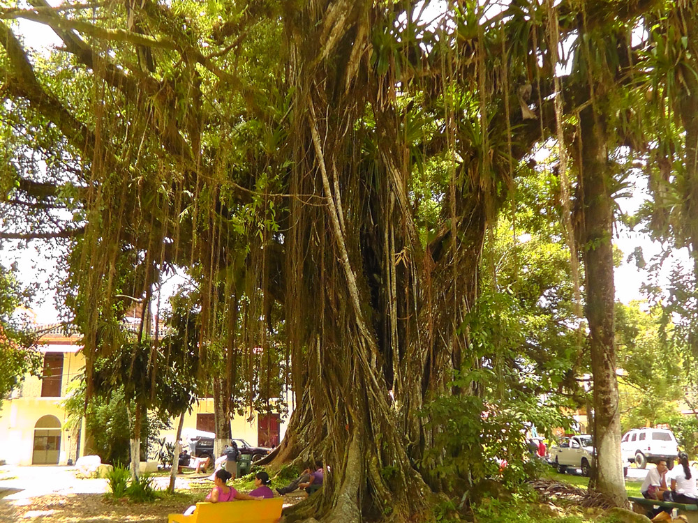 This huge tree is in the city park with vines hanging everywhere, and many large bromeliads and other plants in it everywhere.