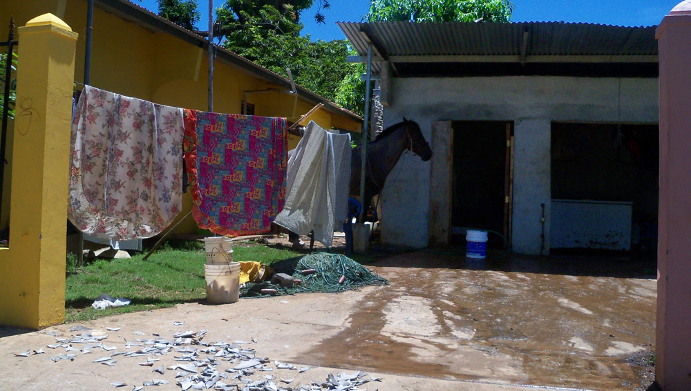 I’m not sure if this horse was guarding the laundry, or just hoping someone would come out of the back door. It looked like fish fins drying on the driveway in the front.
