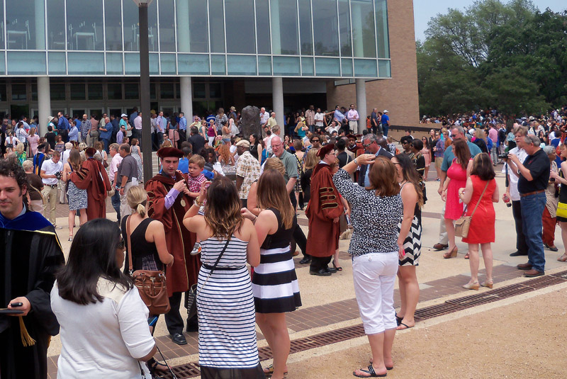 After the ceremony, the crowd gathers in the courtyard where family and friends can look for their graduates.