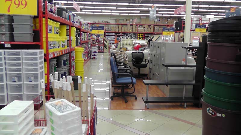 On the left is the back of the paint department with the 5 gallon buckets. In the center area is furniture, mainly desks, chairs, filing cabinets, and some tables.