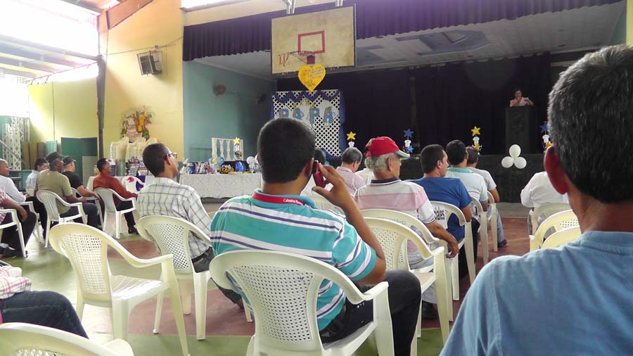 The fathers are seated waiting for the party to begin. Notice the gifts on the table, and the prizes on the stage.