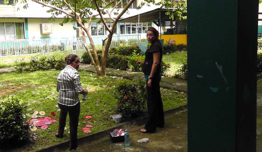 These teachers were painting disks red, maybe for some sort of decoration?