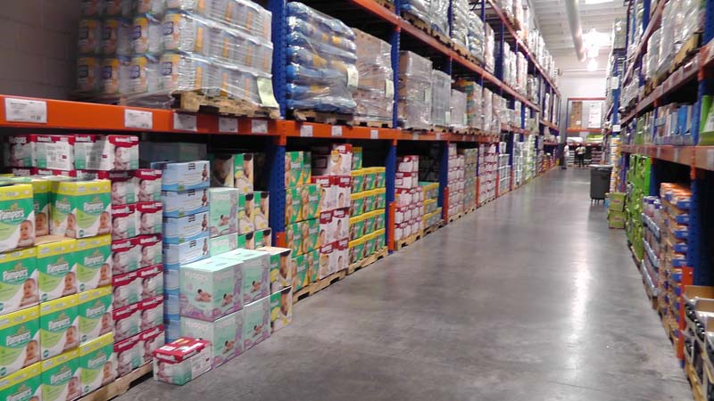 Along the back wall, lots of diapers, paper goods, and cleaning supplies
