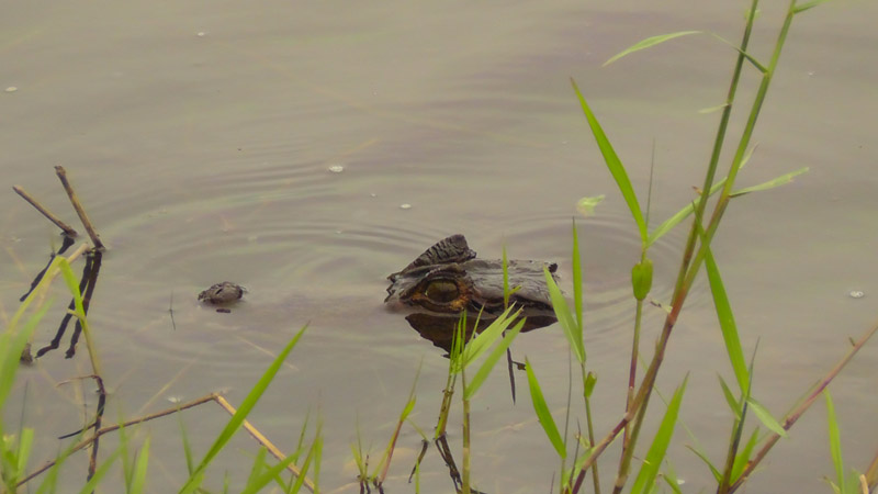 We were told that this caiman always hangs out in the little river just beyond the sign.