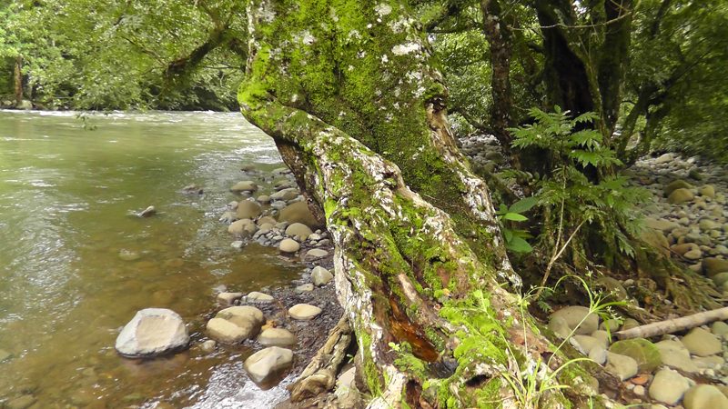 One of the bent over trees along the bank. They were all covered with moss and other plants.
