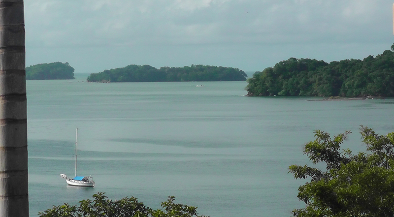 Looking out over the quiet water to the islands beyond.