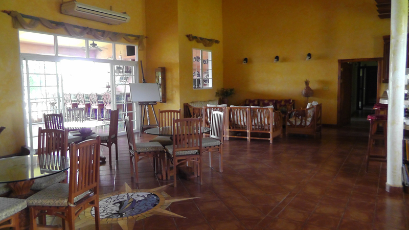 A large, bright dining room.