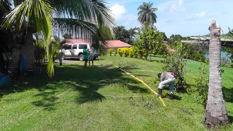 Chatting with the owner while his helper trims a huge piece of bamboo.