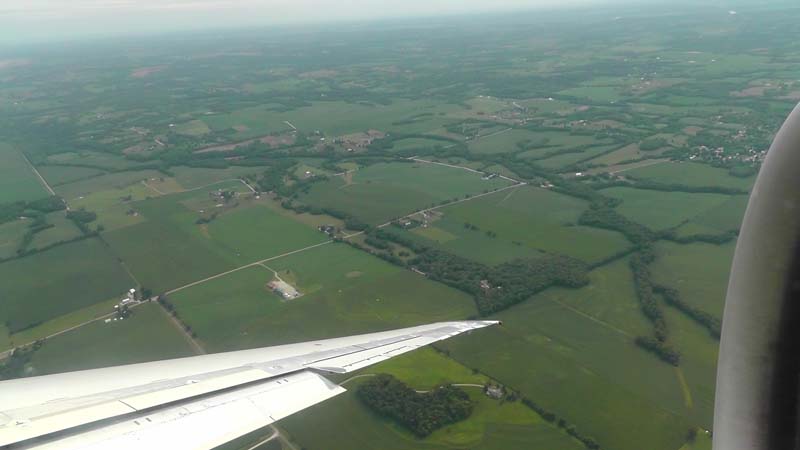 Flying into Kansas, the green farmland below.