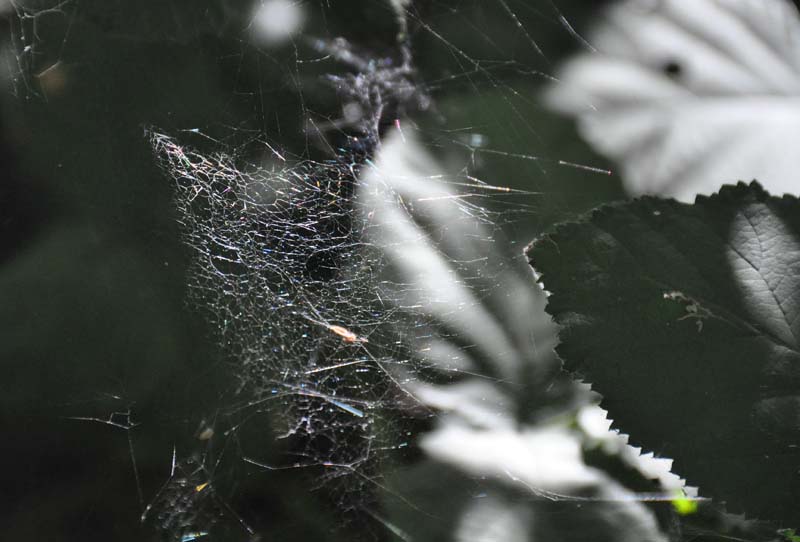 A Spider web in the blackberry bushes catches the sunlight.