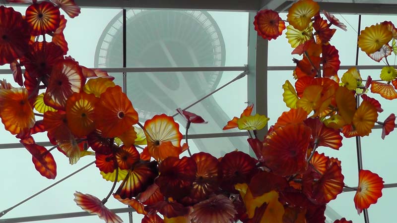 In the “Glass House” if you stand in the right spot you can see the Space Needle behind the glass.