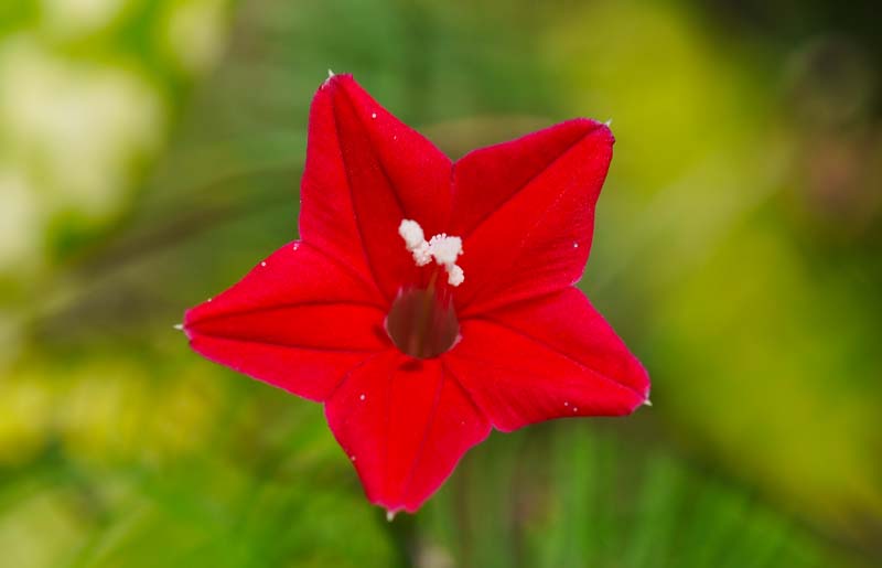 A tiny red flower on a delicate vine that is climbing up my back fence.