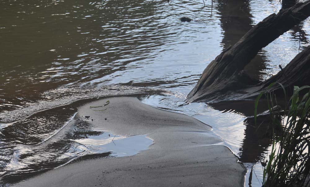 More water rushes by a muddy spot on the river bank.