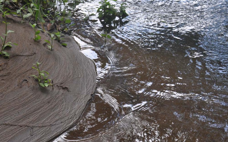 Water swirls around the edge of the river bank, ridged from the higher water during the storm.
