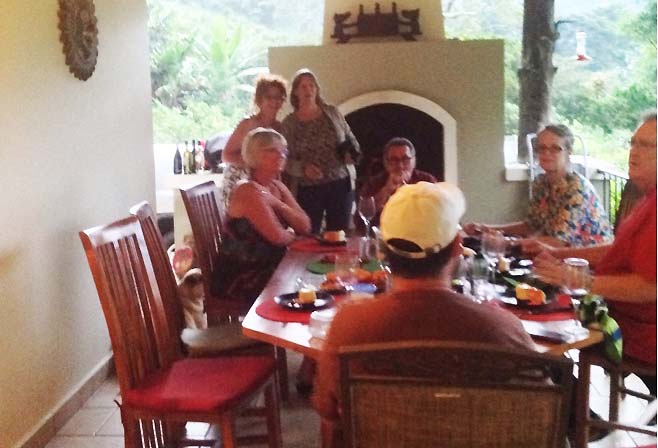 The dinner crowd, Holly and I in front of the fireplace, Cindy and her husband in front of us, Scott in the white hat at the other end of the table, Jerry and Jennifer on the right. My husband Joel is behind the camera taking photos on his iPad.