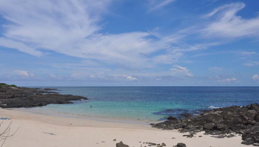 The view from the other side of the island facing the open water, where the blue sky meets the blue Pacific Ocean.