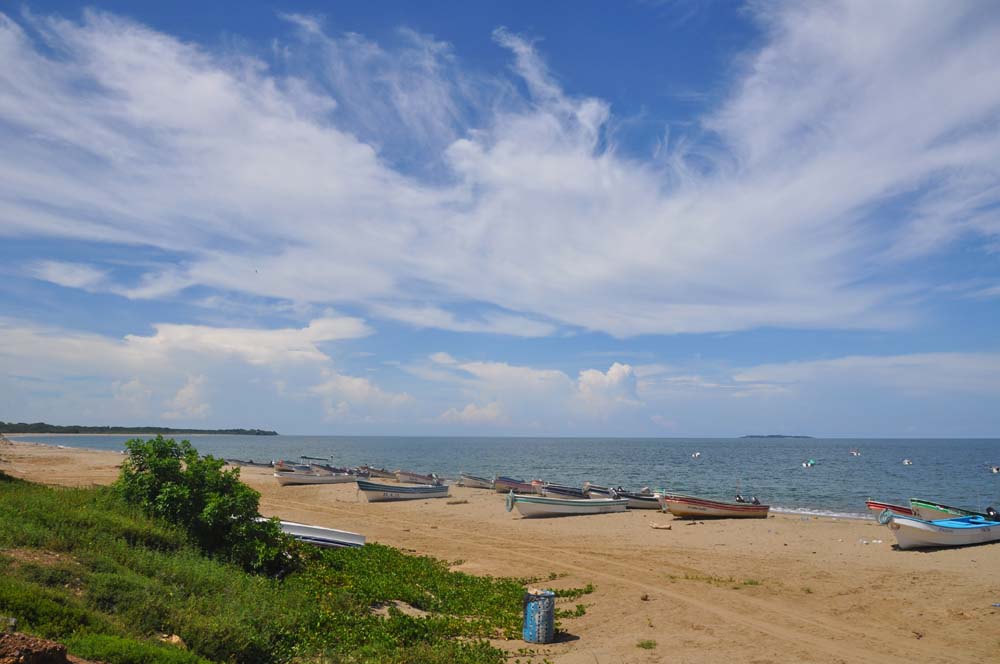 Boats wait on the beach. Our destination is the island in the distance. The gorgeous clouds really put this day over the top.
