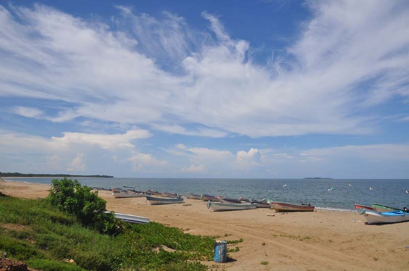 The beach on the mainland, and the boats standing by. If you want to go out, a couple guys come help. They put rollers under the boat, and then just roll it into the water.