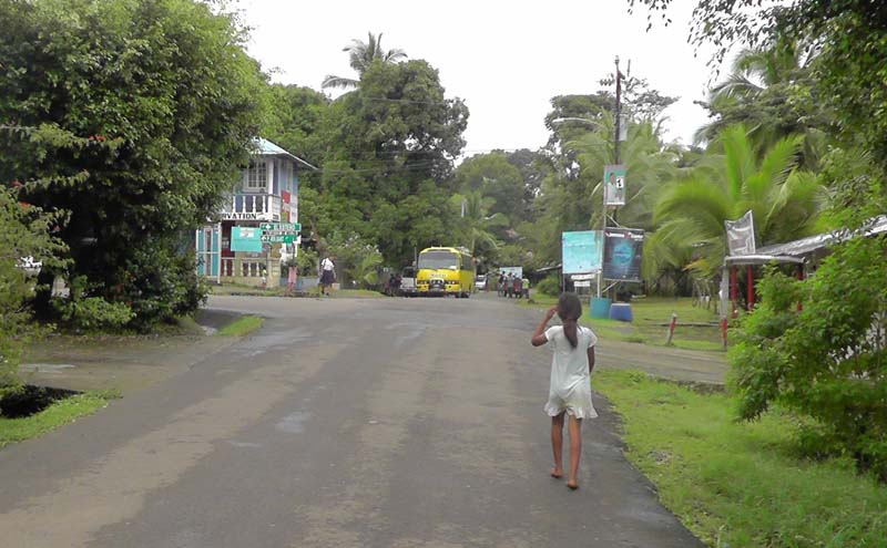 This is the center of town, basically an intersection with a convenience store. This little barefoot girl had just handed off a large baby to another girl before she headed down the road.