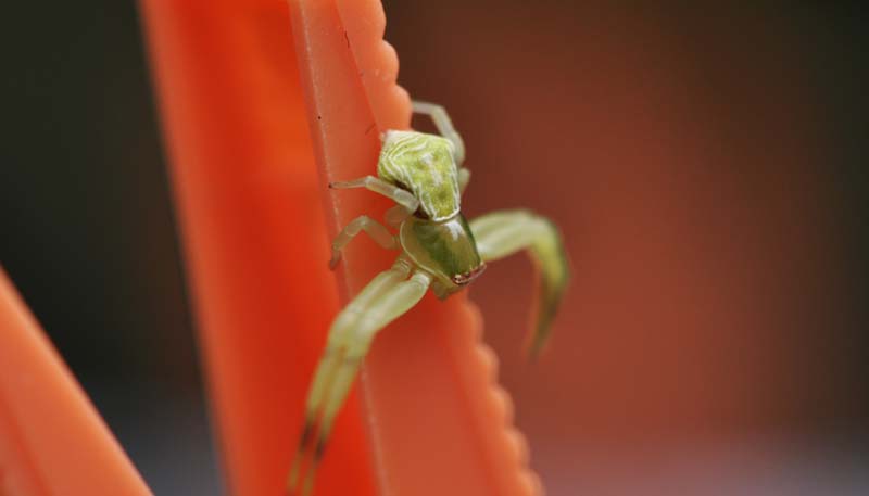 I went to hang laundry and discovered this little green spider on a clothespin. I don’t think I’ve seen one like it before.