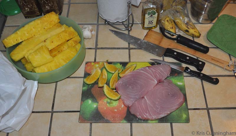 Dinner – the fish steaks, a huge pineapple which was really really good, some garlic and limon for the fish, and we also cooked a chayote and a chubby green striped thing that I thought was a zucchini, but had a slightly different flavor. Everything was excellent, and we are going back to the fish market again tomorrow!