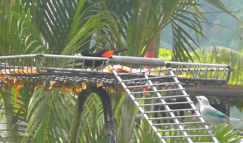 The bird feeder full of fruit, very popular with a lot of different types of birds. The one on top is beautiful, all black until it moves its wings and reveals the bright orange underneath.