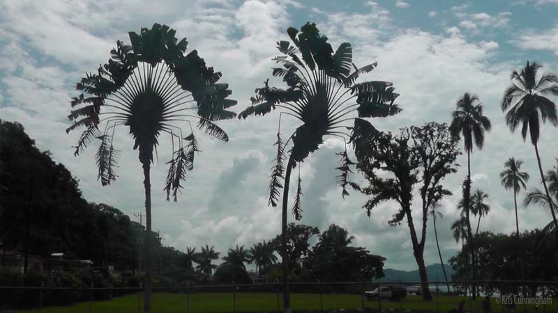 These huge traveler palms looked impressive against the backdrop of beautiful afternoon clouds. The piece of land behind them is for sale, so we walked around there too. The workmen trimming the grass warned us to stay away from the tall coconut palms, because if a coconut falls on your head it’s like being hit with a large rock!