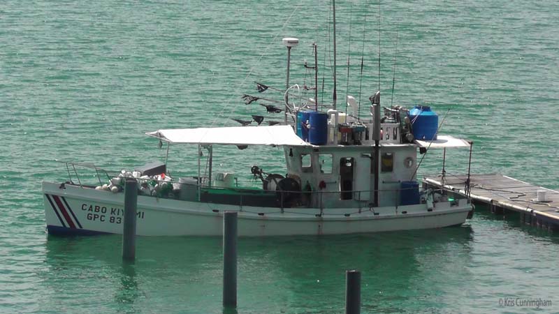 Taking a close look at the photo, the boat is a long liner. That reel in front of the pilot house holds the miles long line. Baited hooks are attached to it and the flags are on buoys that mark the beginning and end of the string. This kind of fishing is usually for swordfish, possibly tuna.