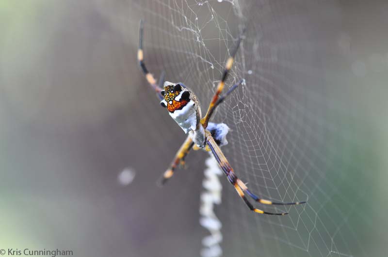This gorgeous spider has been living in our lipstick palm near the front door. Yesterday he apparently has caught something and had it all wrapped up in silk.