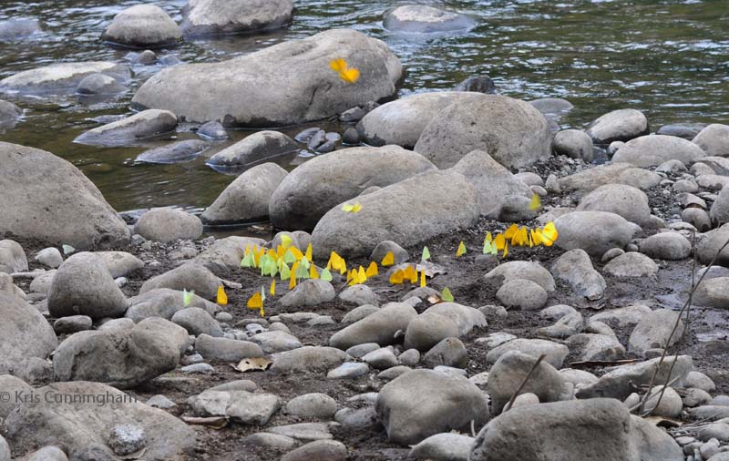 There were a lot of these green and yellow butterflies at the river one day.