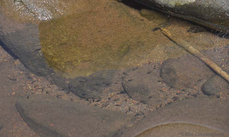 Tiny fish swim around the rocks.