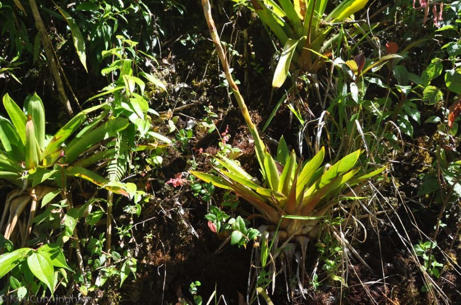 Some of the many bromiliads and other interesting plants growing on a rock.