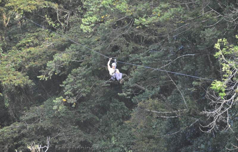A guy comes in for a landing on the zip line.