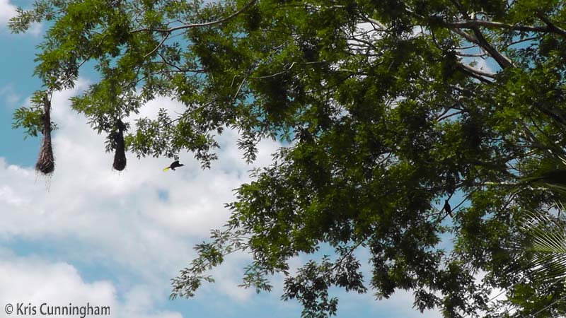 I caught one of the oropendulas leaving the nest, and there is another in the tree on the right side of the photo.