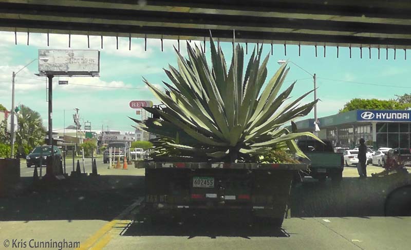 I’m driving home this morning, and find myself following this truck. I could not see anything holding this large plant in place except for its own weight.