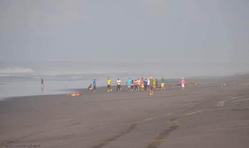 A group gets a beach soccer game together. When we walked by, we saw that one team was blindfolded!