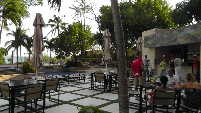 This is the terrace between the older building and the swimming pools. These appeared to be residents relaxing and visiting the snack bar there.