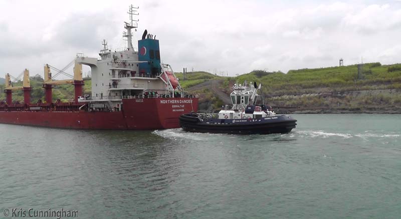 We were told that ships can only go one direction through the Culebra Cut because it is too narrow, so from midnight to noon they go north, and from noon to midnight they go south. Since it was now past noon we started seeing ships passing us in the other direction. This is the Northern Dancer, a cargo ship of Gibraltar.