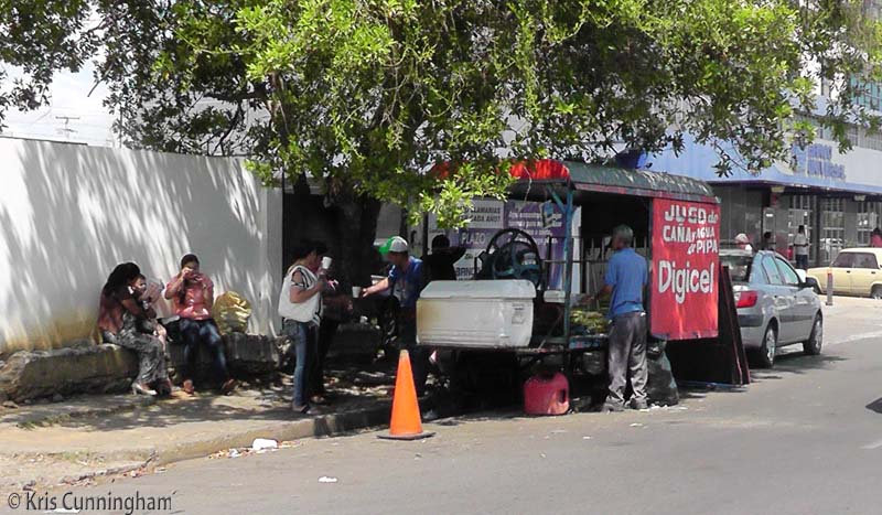 Sugar cane juice made on the spot in David. They feed the canes into this machine, the wheel turns, the cane is crushed, and out comes the juice for a sweet drink.
